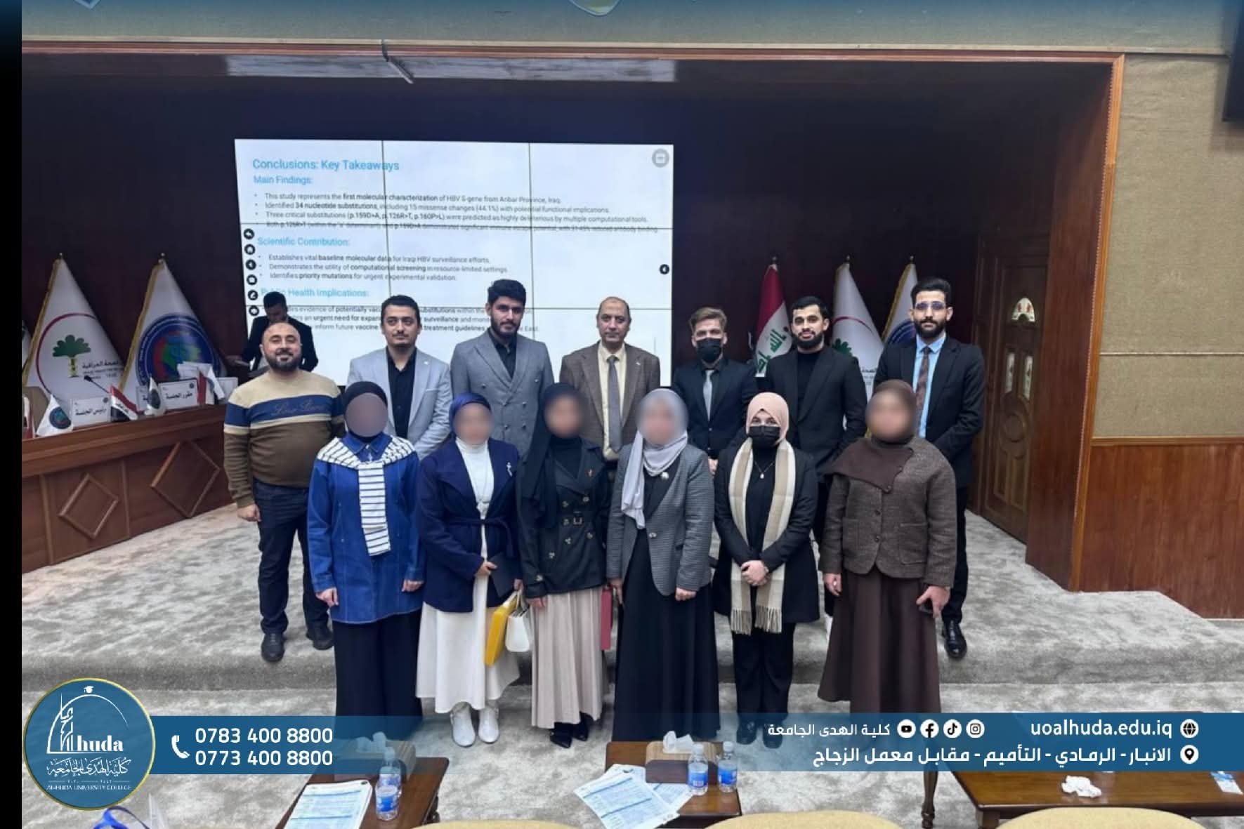 In line with the directives of the Dean of Al-Huda University College, the College’s Pharmacy Department and Medical Laboratory Technology Department participated in the 13th Medical Scientific Conference organized by the Anbar Health Directorate, which concluded on Sunday, December 7, 2025, under the patronage of His Excellency Minister of Health, Professor Dr. Saleh Mahdi Al-Hassnawi, and under the supervision of the Director General of Anbar Health Directorate, Dr. Khudair Khalaf Shalal.